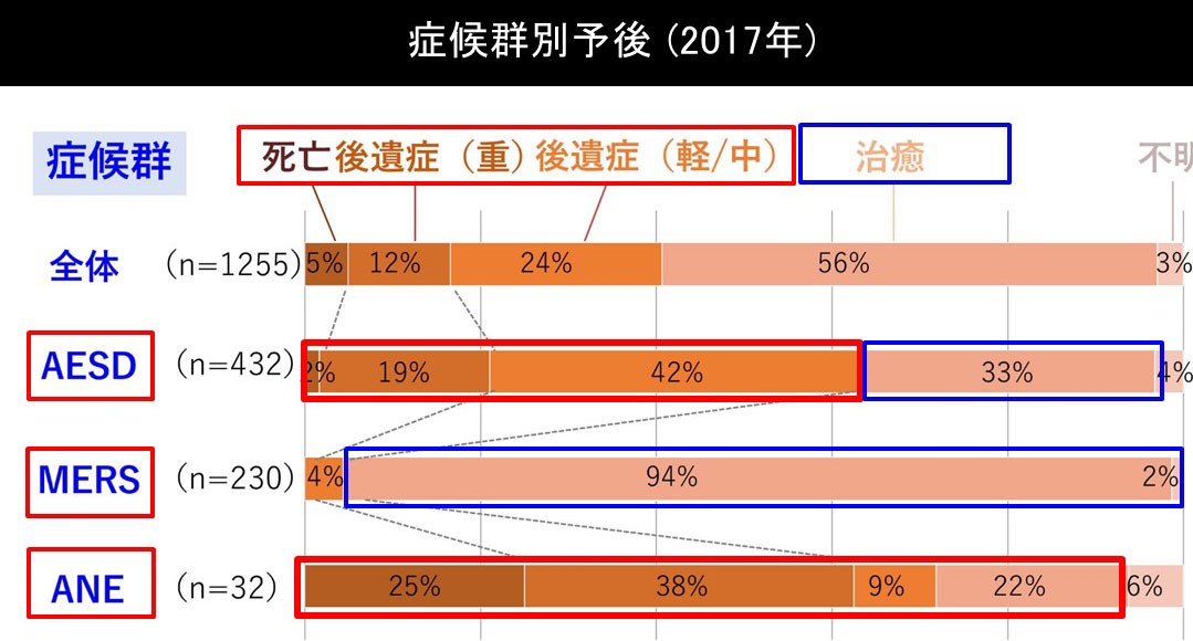 に施行されました。2017年のデータによると、国内の1年あたり症例数は500-800人、0-3歳の乳幼児に最も多く、症候群別(図1-A)では多い順にAESD (34%)、MERS (18%)、ANE